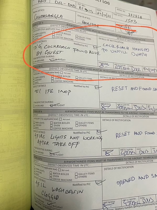 সামাজিক যোগাযোগমাধ্যমে ছড়িয়ে পড়া ছবিতে দেখা যায়, একই পাতায় সাধারণ প্রযুক্তিগত সমস্যা যেমন ওয়াশবেসিন আটকে যাওয়া, লাইট কাজ না করা ইত্যাদি- এইসবের পাশাপাশি লেখা রয়েছে, ‘Cockroach found alive by guest– cockroach hanged until death.’