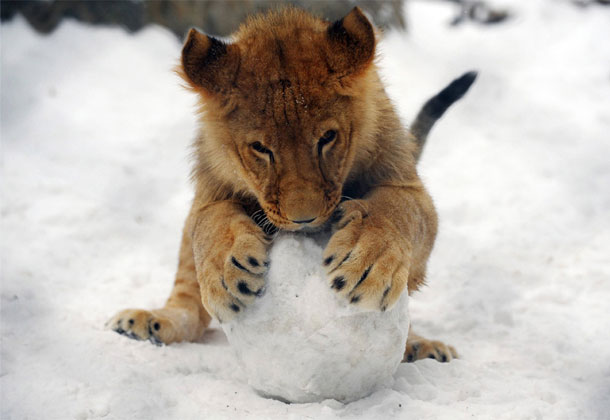 বাচ্চা সিংহটি বরফ নিয়ে মনের আনন্দে খেলছে!