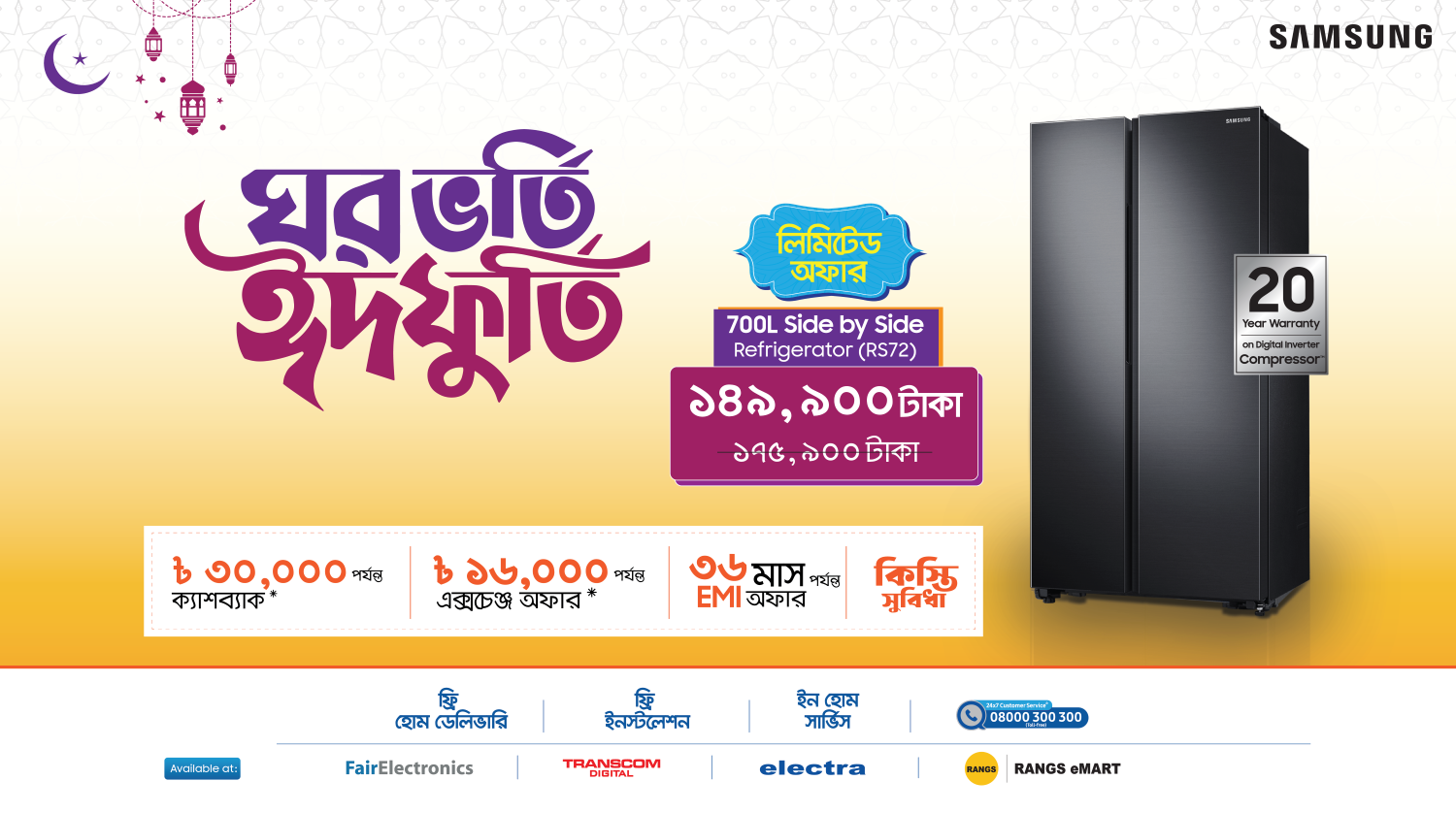 ক্যাম্পেইনের অধীনে ঈদের আনন্দকে বহুগুণে বাড়িয়ে তুলতে রেফ্রিজারেটরের ক্ষেত্রে দেওয়া হচ্ছে বিভিন্ন রকম অফার। এই ক্যাম্পেইনে থাকছে ক্যাশব্যাক ও এক্সচেঞ্জ অফার; এতে করে প্রিমিয়াম লুকের স্যামসাংয়ের ৭০০ লিটার সাইড-বাই-সাইড রেফ্রিজারেটর এখন পাওয়া যাবে ৩০ হাজার টাকা ক্যাশব্যাক অফার। ছাড়ের পর রেফ্রিজারেটরটির বর্তমান মূল্য ১,৪৯,৯০০ টাকা !