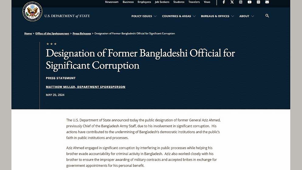 US State Department spokesman Matthew Miller said in a statement that the State Department took this action against former Bangladesh Army Chief General (retd) Aziz Ahmed due to his significant involvement in corruption. His (General Aziz's) actions have contributed to undermining the people's confidence and trust in the democratic institutions and government institutions and processes of Bangladesh.