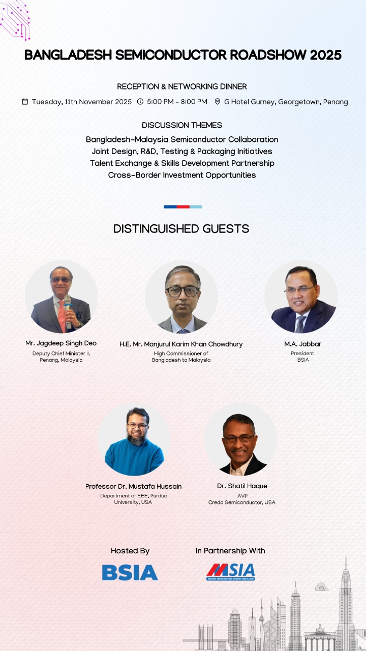 The Dhaka Times Desk বাংলাদেশ সেমিকন্ডাক্টর ইন্ডাস্ট্রি অ্যাসোসিয়েশন (BSIA) আগামী ১১-১৩ নভেম্বর ২০২৫ তারিখে মালয়েশিয়ার পেনাং-এ তিন দিনব্যাপী আন্তর্জাতিক অনুষ্ঠান “BSIA Roadshow 2025” আয়োজন করতে যাচ্ছে।